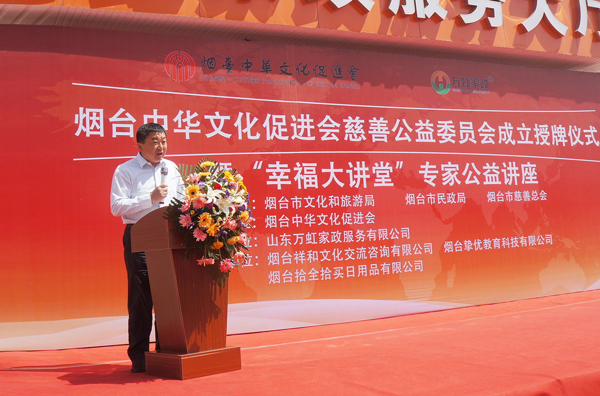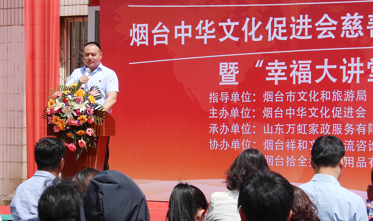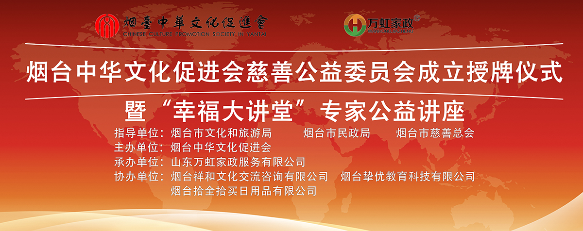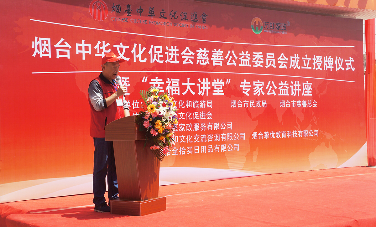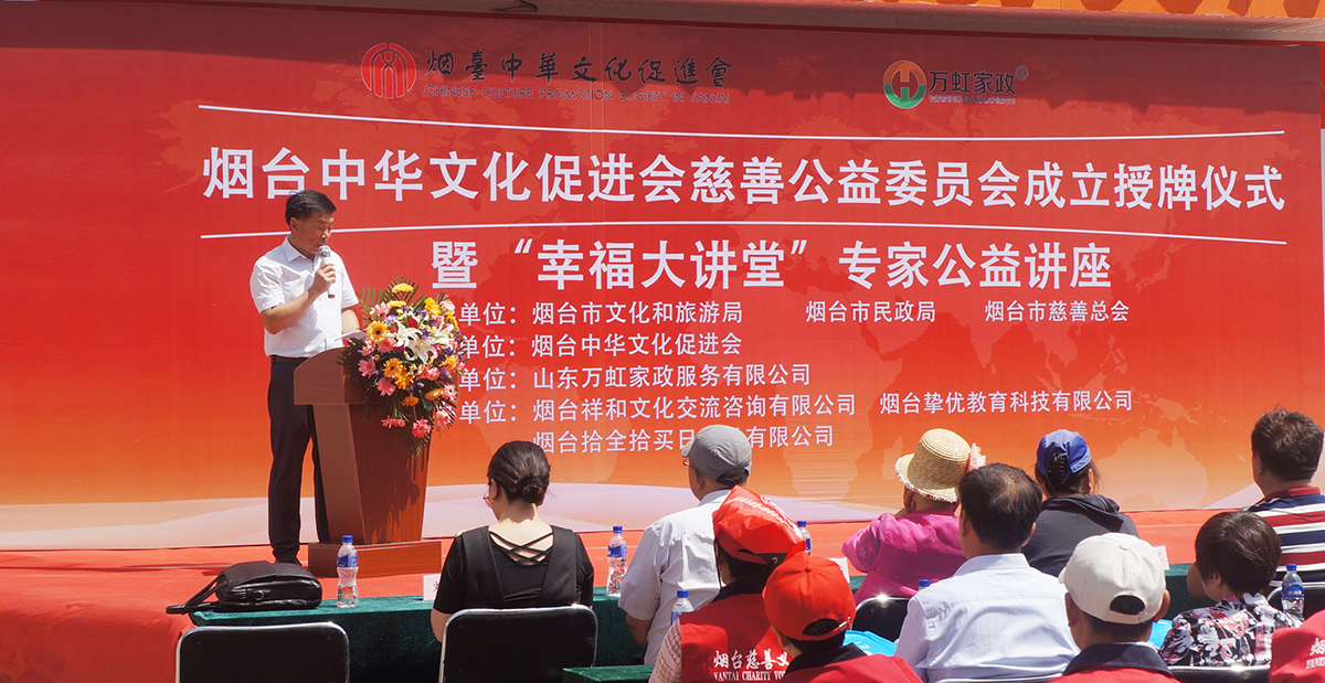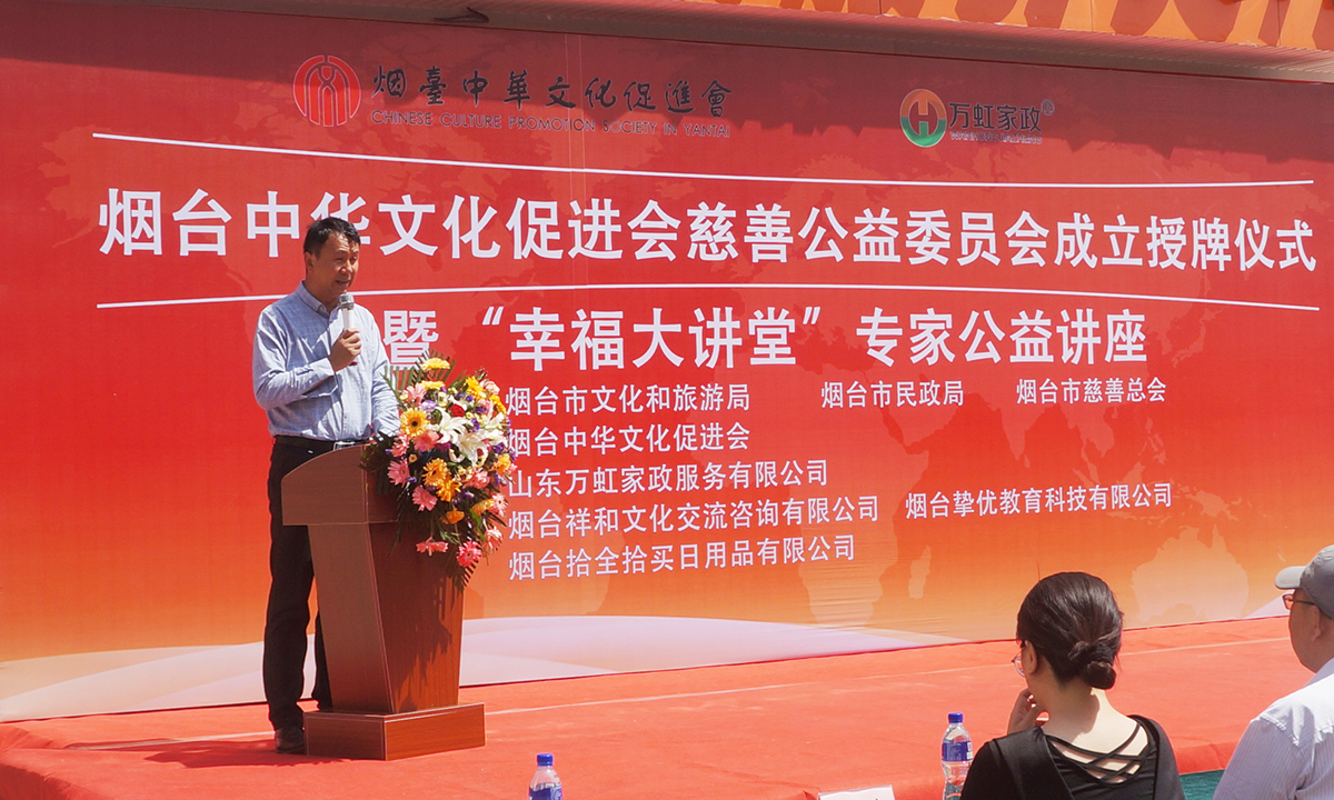 5月29日,煙臺中華文化促進會慈善公益委員會成立授牌儀式暨“幸福大講堂”專家公益講座于山東萬虹家政服務有限公司舉行,煙臺市慈善總會副主任許夫新以及煙臺日報社、煙臺電視臺、煙臺晚報、膠東在線、煙臺廣播電視報等媒體的主任、記者、社區(qū)領導、贊助企業(yè)領導、義工代表等參加了活動?;顒佑蔁熍_中華文化促進會秘書長潘松主持。這標志著煙臺的慈善公益事業(yè)又增添了一股新的生力軍。