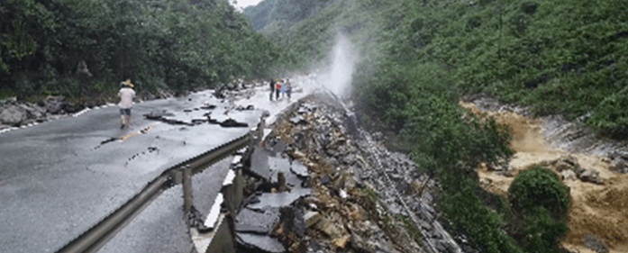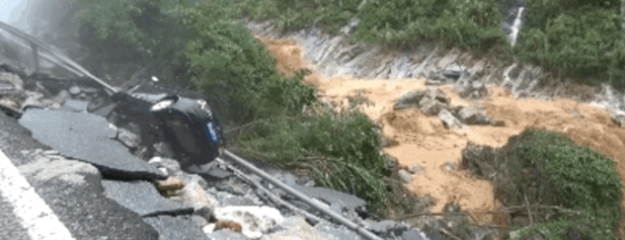 圖為事發(fā)地點(diǎn),山洪把路面的柏油層沖得支離破碎