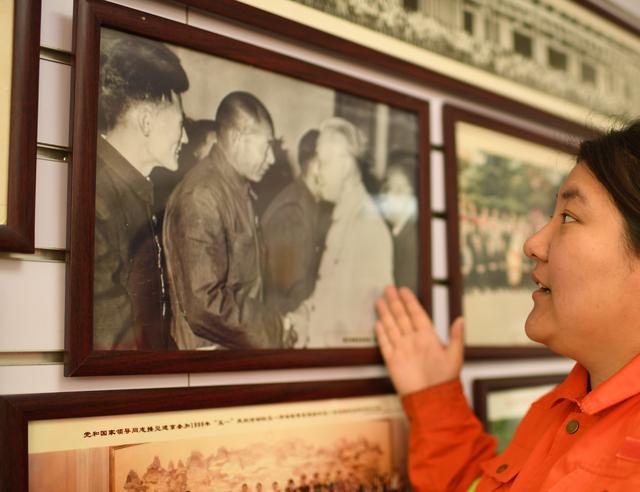 圖為李萌站在《劉少奇接見時(shí)傳祥》的歷史照片前