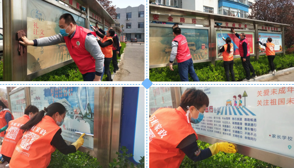 宣傳欄作為傳播信息、展示形象的窗口,是文明城市一張重要的名片。志愿服務隊首先認真擦洗了社區(qū)戶外宣傳欄上的灰塵、污漬、廣告膠印,除了攜帶常用的抹布、百潔布、水桶、海綿拖把之外,大家還運用了伸縮桿、刮子等保潔工具,充分體現(xiàn)了萬虹家政的專業(yè)和用心。在志愿者齊心協(xié)力之下,社區(qū)宣傳欄的環(huán)境衛(wèi)生狀況明顯改觀,受到居民朋友的交口稱贊。??