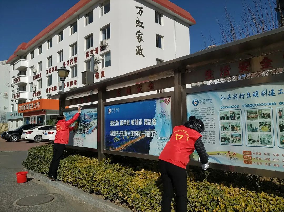 2022年3月5日上午,為繼承和發(fā)揚雷鋒精神、營造文明和諧的社區(qū)氛圍,萬虹家政巾幗志愿服務隊于全國第59個學雷鋒紀念日在社區(qū)開展“弘揚雷鋒精神,共建清潔家園”志愿服務活動。主要針對小區(qū)內宣傳欄進行了擦拭,將違規(guī)張貼在宣傳欄上的小廣告清理鏟除。