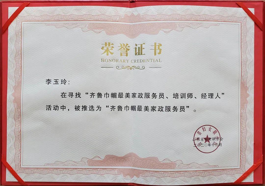 【喜報(bào)】萬(wàn)虹家政:李玉玲榮獲“齊魯巾幗最美家政服務(wù)員”榮譽(yù)